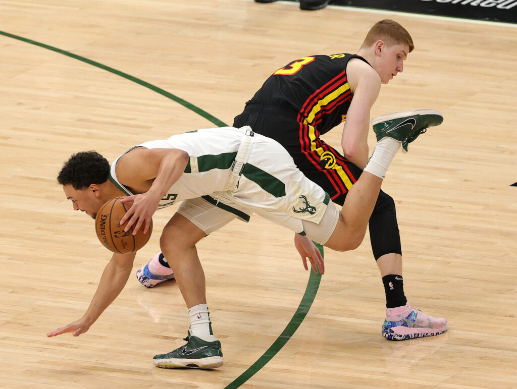 MILWAUKEE, WISCONSIN – JULY 01: Bryn Forbes #7 of the Milwaukee Bucks drives around Kevin Huerter #3 of the Atlanta Hawks during the second half in Game Five of the Eastern Conference Finals at Fiserv Forum on July 01, 2021 in Milwaukee, Wisconsin. NOTE TO USER: User expressly acknowledges and agrees that, by downloading and or using this photograph, User is consenting to the terms and conditions of the Getty Images License Agreement. (Photo by Stacy Revere/Getty Images)
