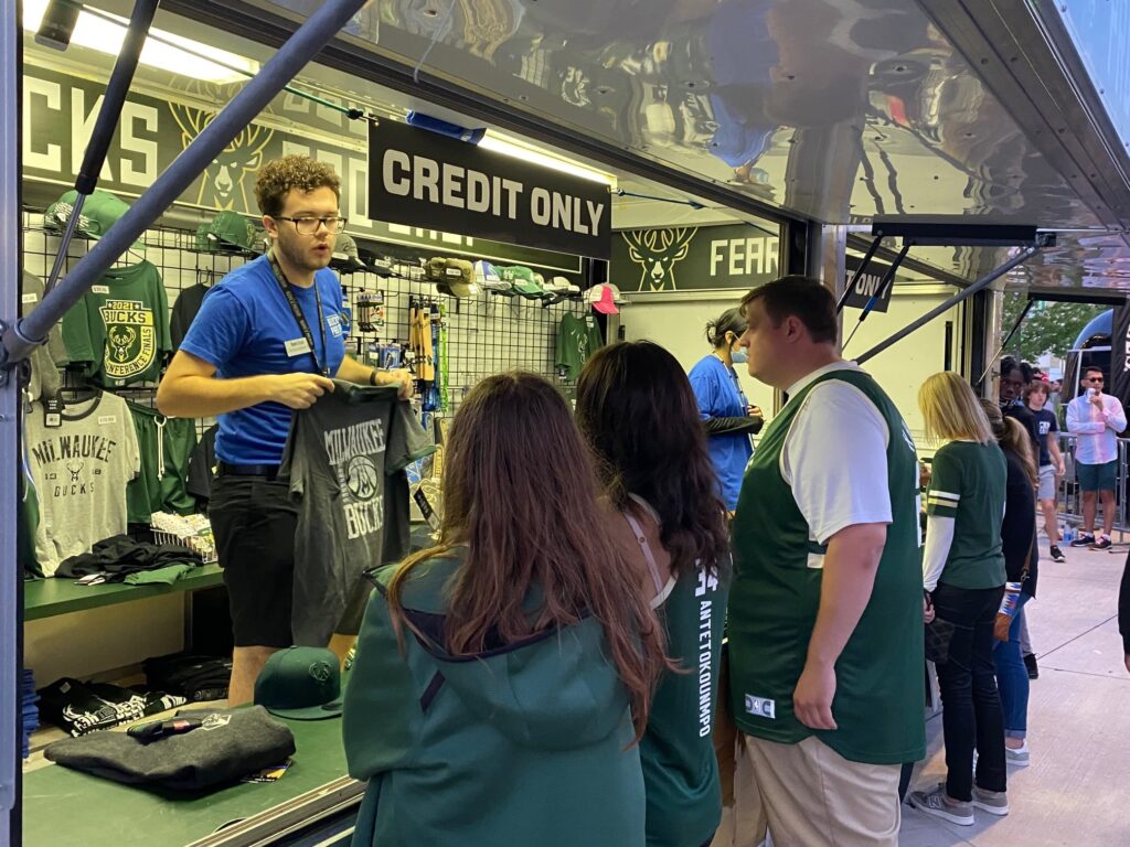 MILWAUKEE, WISCONSIN – JULY 01: Basketball fans arrive before Game Five of the Eastern Conference Finals between the Milwaukee Bucks and the Atlanta Hawks at Fiserv Forum on July 01, 2021 in Milwaukee, Wisconsin. NOTE TO USER: User expressly acknowledges and agrees that, by downloading and or using this photograph, User is consenting to the terms and conditions of the Getty Images License Agreement. (Photo by Patrick McDermott/Getty Images)