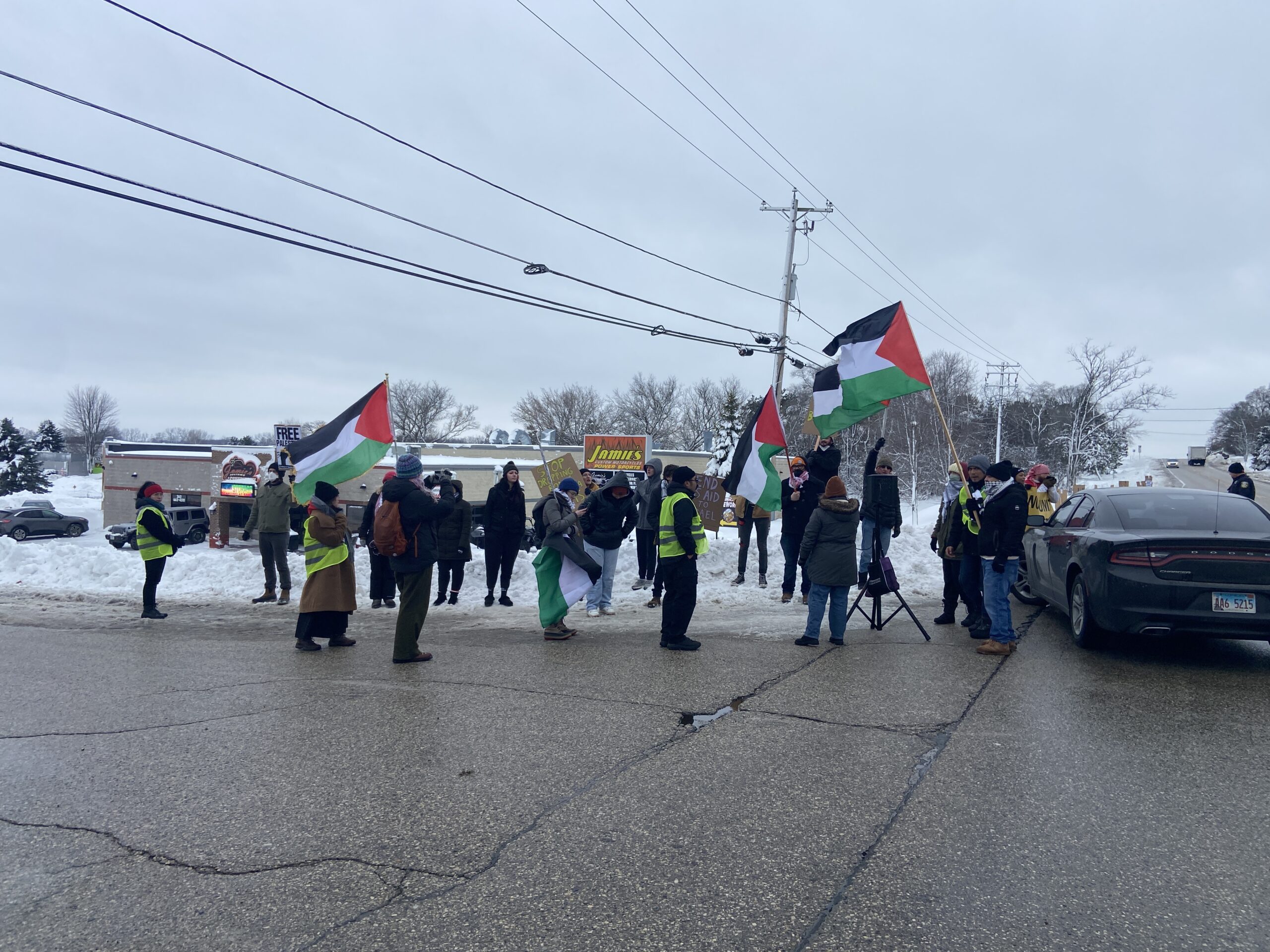 A protest organized by Reproductive Justice Action Milwaukee and the Wisconsin Coalition for Justice in Palestine brought dozens of people chanting and waving Palestinian flags to the intersection of National Ave. and Enterprise Dr.