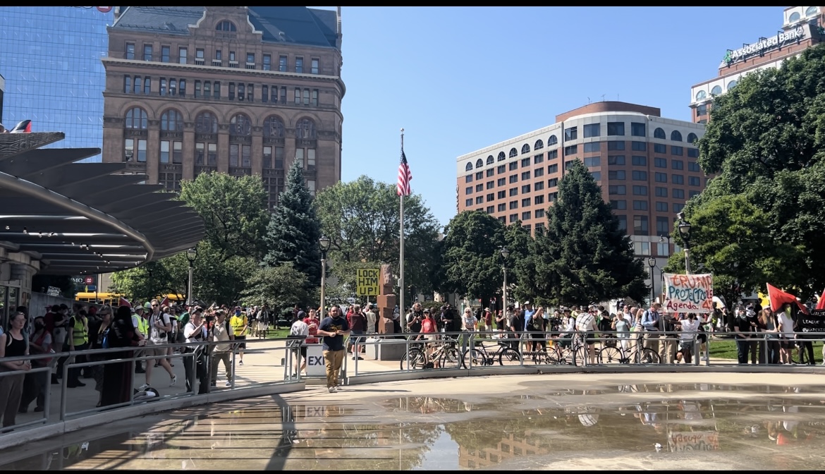 MILWAUKEE – The Republican National Convention officially began in Downtown Milwaukee on Monday, July 15th. On the other side of the Milwaukee River at Red Arrow Park, hundreds of protestors gathered to protest the Republican Party and their platform.