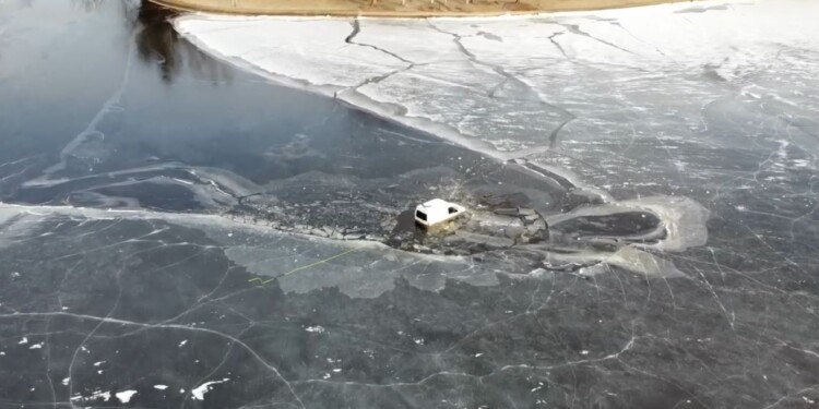 It was described as a small van with headlights on and the 911 caller had reason to believe everyone had escaped from the vehicle. Authorities say the driver, delivering food to someone fishing on the lake, left the area on foot before they arrived.