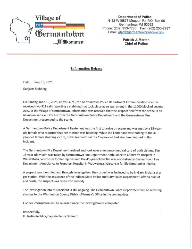 Germantown Police will be referring charges to the Washington County District Attorney’s Office.