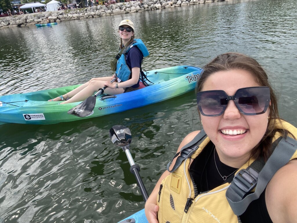 Reporters Jessica Gatzow and Elizabeth Lintonen trying out kayaking at Summerfest 2025.