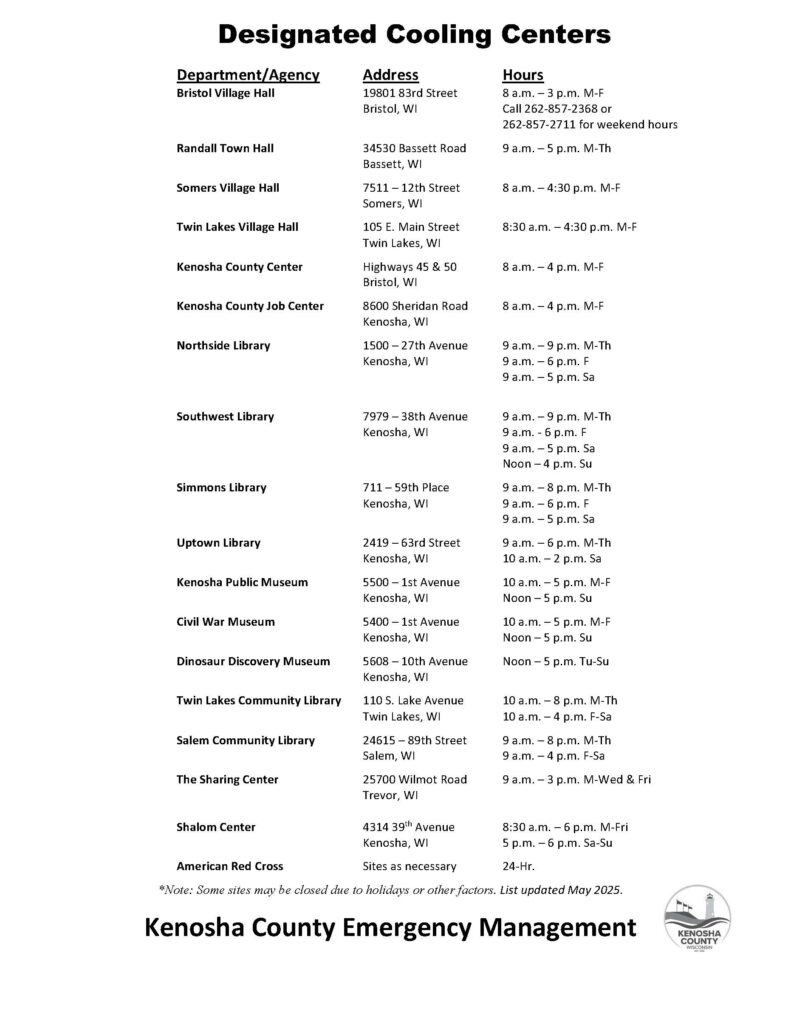 | Ascension All Saints Hospital | 3801 Spring St, Racine WI 53405 | 262-687-4011 | Daily 24 hours – ER entrance (ONLY DURING DECLARED HEAT EMERGENCY) | ||