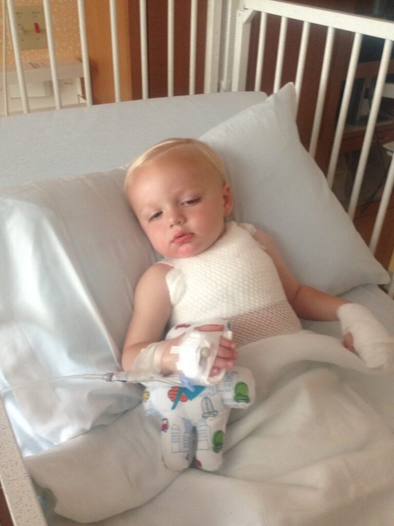 The scalding grease severely burned two year old Cam’s chest and chin.