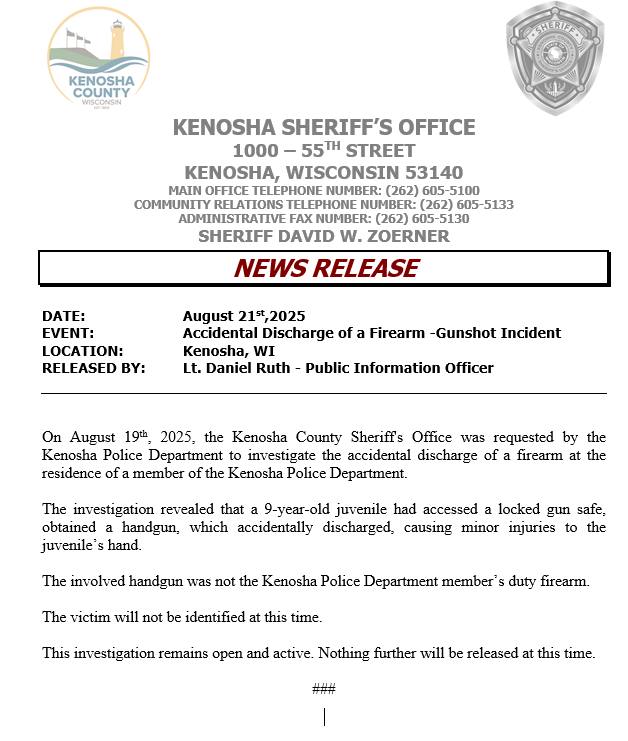 On August 19, the Kenosha County Sheriff’s Office was requested by the Kenosha Police Department to investigate the accidental discharge of a firearm at the home of a member of the Kenosha Police Department.