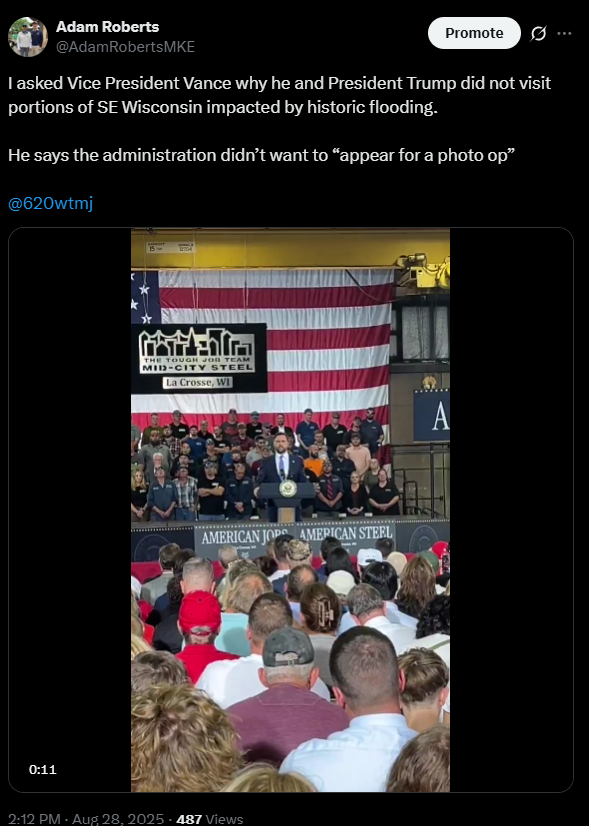 The VP’s visit comes one day after Wisconsin Governor Tony Evers formally requested a presidential disaster declaration for the state following historic flooding August 9 and 10 that has already caused tens of millions of dollars in estimated damage. Vance wouldn’t guarantee the Trump administration would approve that request, noting it was still too early to formally review the Governor’s ask.