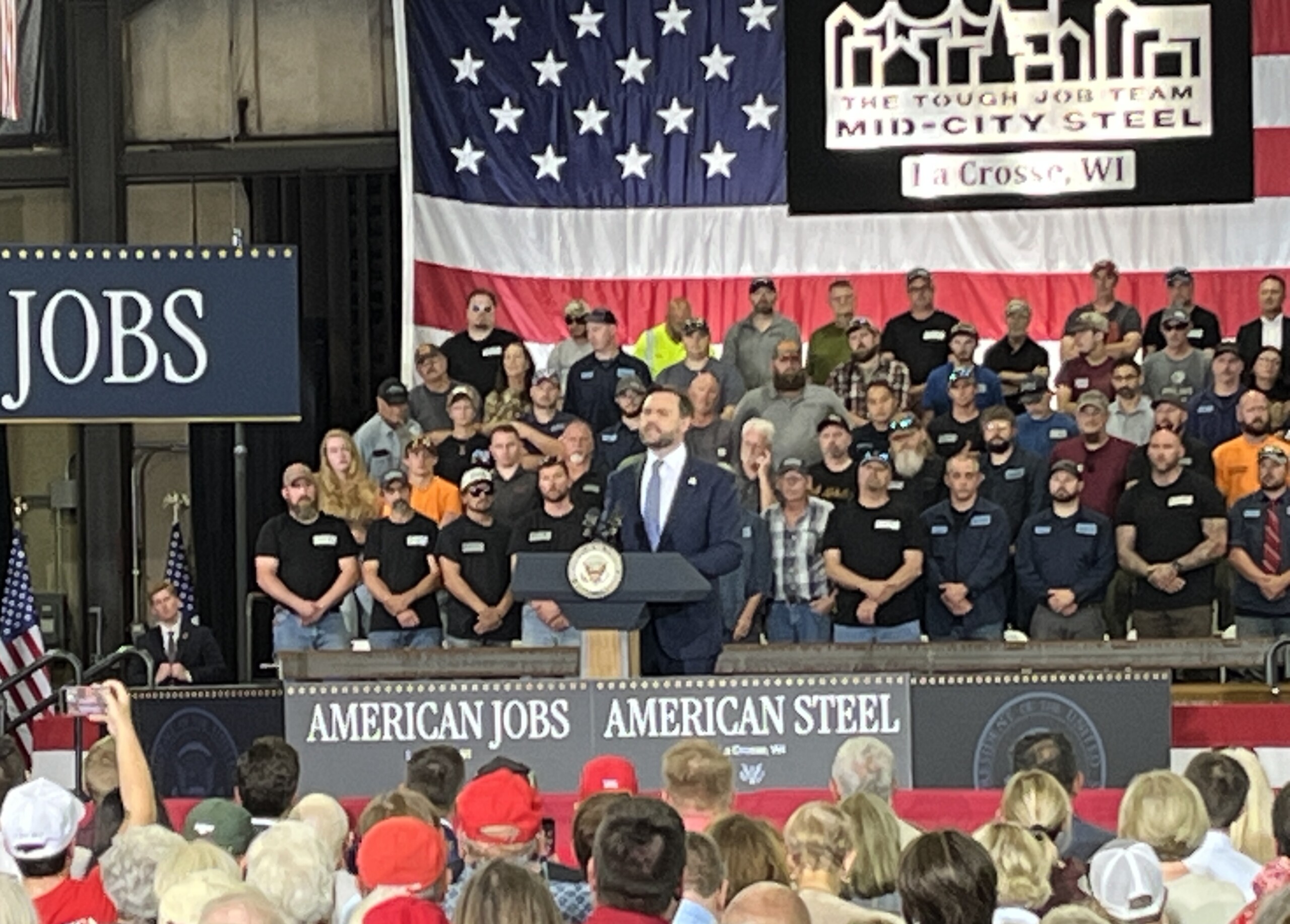 Nine months later, the Vice President returned to the Coulee Region Thursday to tout the President’s so-called “One Big Beautiful Bill” signed into law on Independence Day this year. He was joined on stage by Secretary of the Interior Doug Burgum, while a crowd that included Wisconsin 3rd District Congressman Derrick Van Orden soaked in his remarks from inside a warehouse at Mid-City Steel.