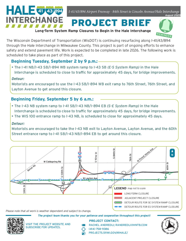 - The Hale Interchange S-E system ramp (I-43 northbound to I-894 eastbound/I-43 northbound/I-41 southbound towards MKE airport) is scheduled to close to traffic for approximately 45 days for bridge work starting September 5 at 6:00 a.m.