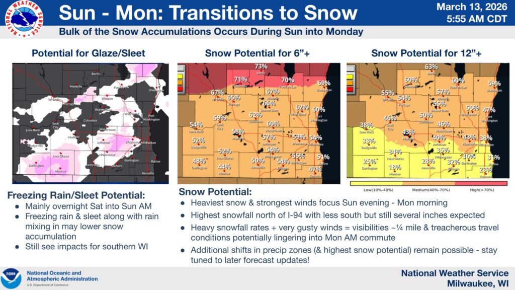 A strong late winter storm system is expected to impact southern Wisconsin during the last half of the weekend in 3 phases: