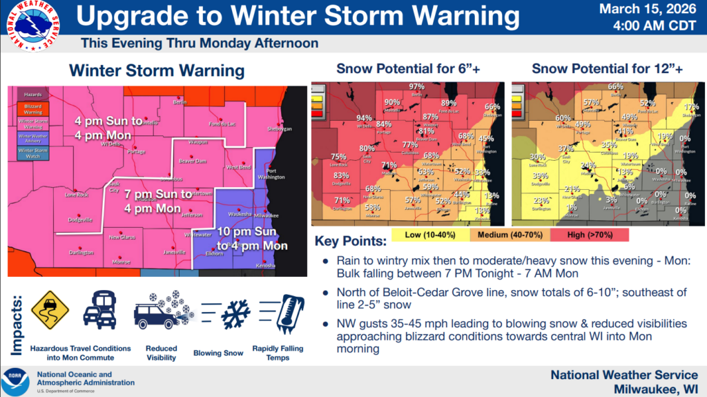 (UPDATE at 3:00 p.m. on 3/15/26) SULLIVAN, Wis. — The National Weather Service (NWS) has upgraded some of the Winter Weather watches and advisories to a Winter Storm Warning for Waukesha, Washington, Jefferson, Ozaukee, Walworth, Sheboygan, Dodge and Fond du Lac counties until 4 p.m. Monday.