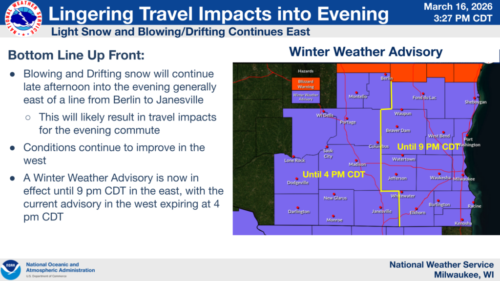 (UPDATE at 2:55 p.m. on 3/16/26) SULLIVAN, Wis. — The National Weather Service has canceled the Blizzard Warning for Southeast Wisconsin. All counties remain under a Winter Weather Advisory until 9 p.m. Monday.