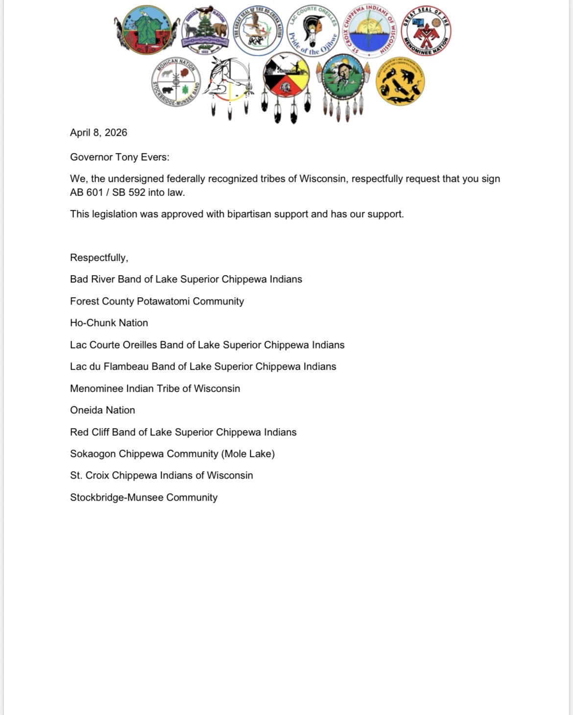 Evers had expressed concern over all of the state’s 11 federally recognized tribes being in agreement on the parameters of the bill, but in a letter sent by the tribes April 8 leaders formally requested the Governor sign the legislation.