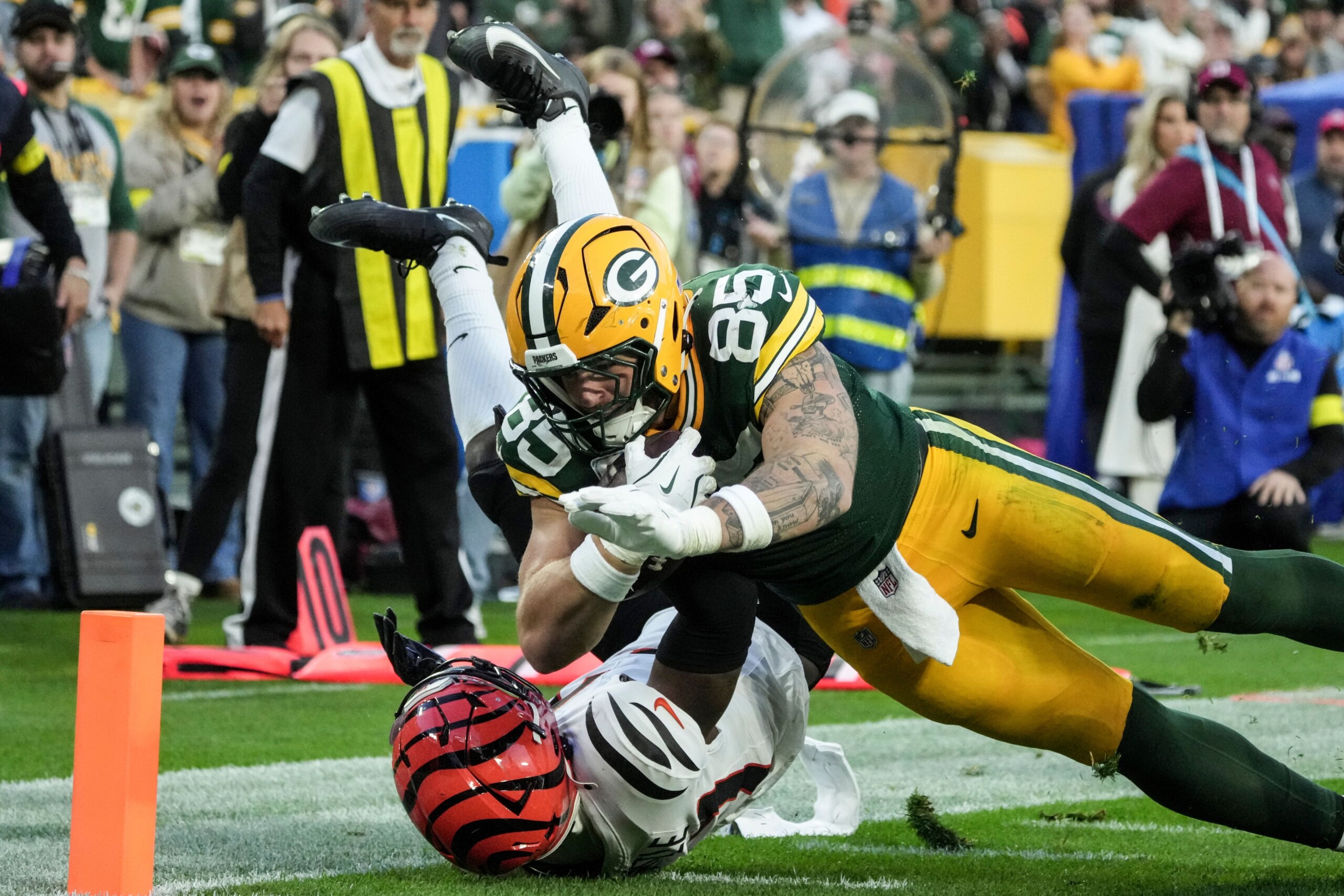 Kraft caught the ball a couple of yards beyond the line of scrimmage, shed a tackle and lowered his shoulder to get through cornerback Cam Taylor-Britt and land in the right corner of the end zone.