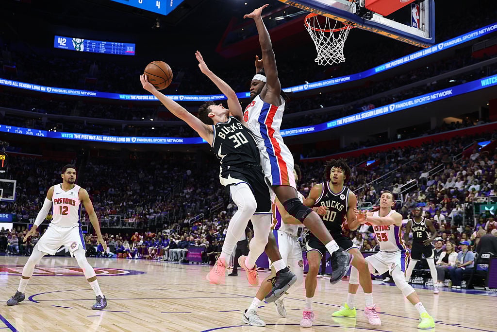 DETROIT, MICHIGAN - APRIL 08: Cormac Ryan #30 of the Milwaukee Bucks drives to the basket against Isaiah Stewart #28 of the Detroit Pistons during the first half at Little Caesars Arena on April 08, 2026 in Detroit, Michigan. NOTE TO USER: User expressly acknowledges and agrees that, by downloading and or using this photograph, User is consenting to the terms and conditions of the Getty Images License Agreement. (Photo by Gregory Shamus/Getty Images)