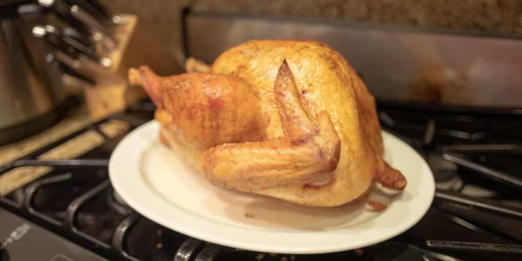 Cooked turkey on platter during the preparation of a traditional American Thanksgiving holiday meal, San Ramon, California, November 23, 2019. (Photo by Smith Collection/Gado/Getty Images)
